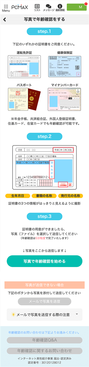 免許証や保険証の生年月日と発行元をサイト運営側に写メで送ることで、確認が取れ次第使えるようになります。